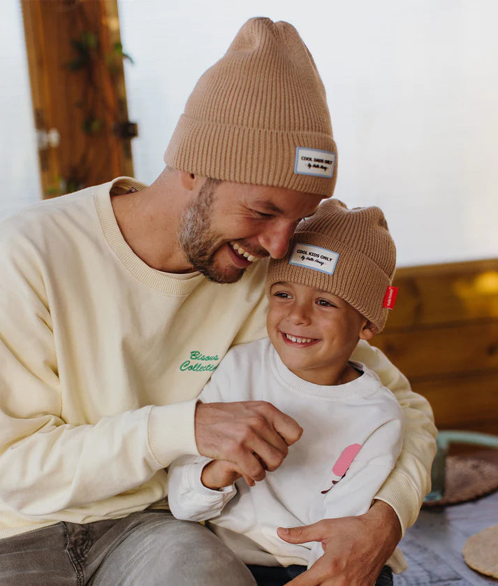 The Pop Champagne beanie for babies and children is a timeless and versatile model. In fact, it's our Jimmy's favorite who takes him to every occasion. It's a beanie for the whole family. It is offered for kids, moms, and dads. Enough to make a nice 💥 matchy-matchy look