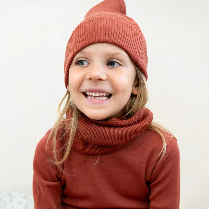 Soft double layered merino wool beanie hat for boys and girls with a mini logo-tag on the turn-up brim.